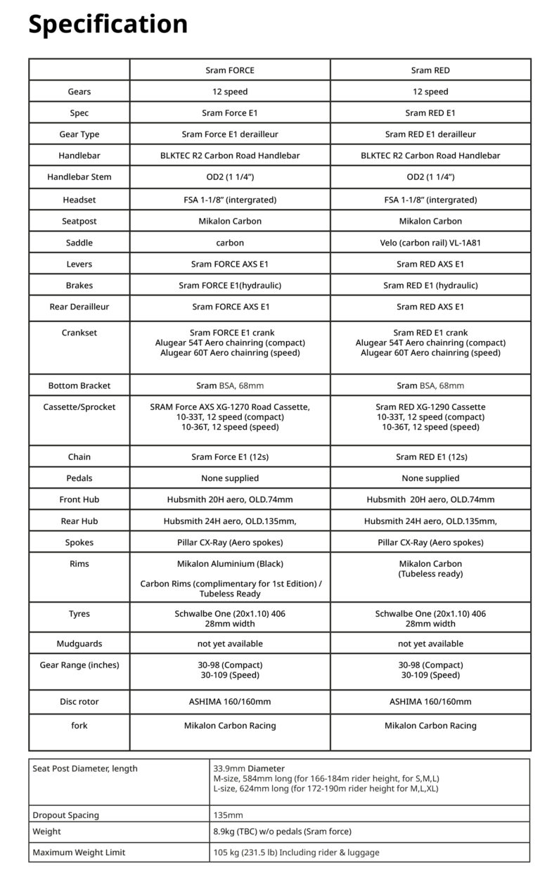 We reserve the right to update or modify any product information at any time without prior notice, including equipment, specifications, models, materials, and pricing. Equivalent or compatible components may be substituted without notice. All listed bike and frame weights are based on pre-production samples at the time of publication, and final production weights may vary.